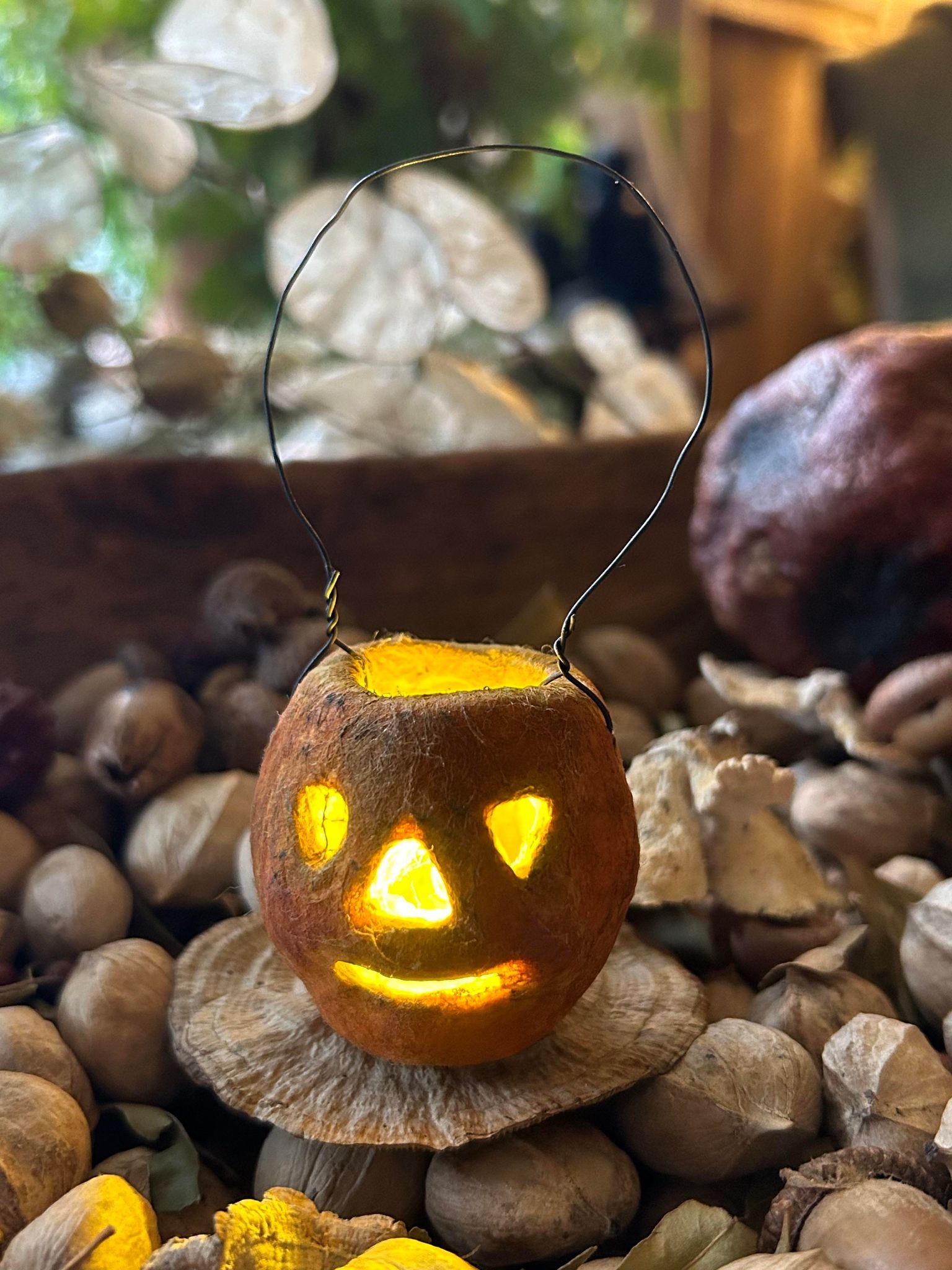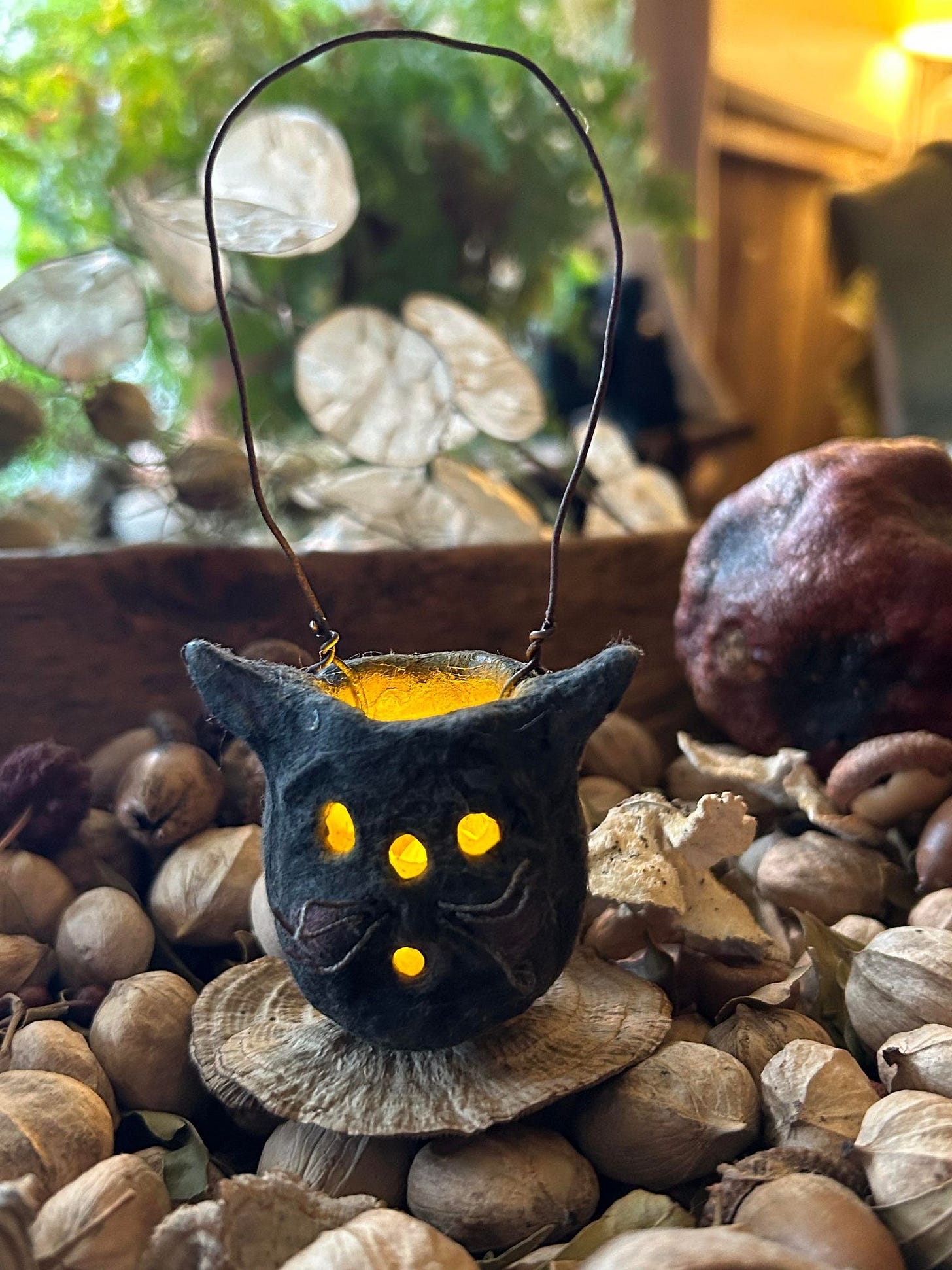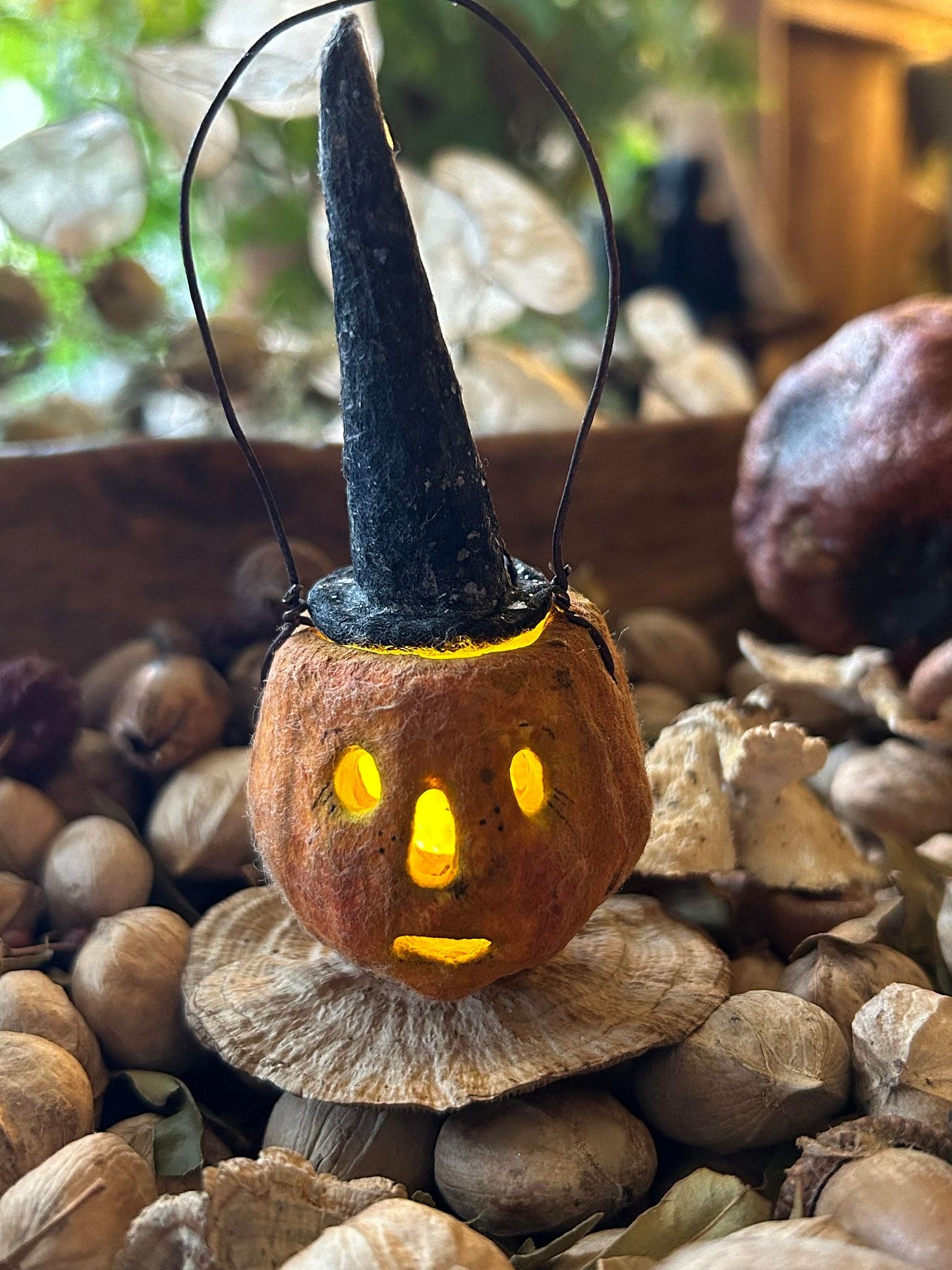 I FINALLY have four spun cotton Jack-O-lanterns ready. Well, three Jack-o-lanterns and one CaT-o-LaNtErN ;). They will be listed on my website this afternoon (and will be shipped out first thing tomorrow morning which MAY give them a chance to reach you by Halloween. UP NEXT TURKEYS & SNOW FOLKE, Linen & Wool Applique Stockings and BEARS!!